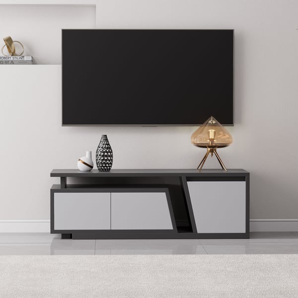 Meuble TV petit design extensible Fero, finition gris, 3 tiroirs et 1 niche (180–280 cm)