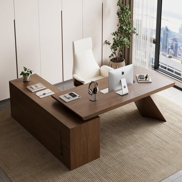 Ensemble de bureau moderne en forme de L en noyer et fauteuil de bureau pivotant réglable en cuir